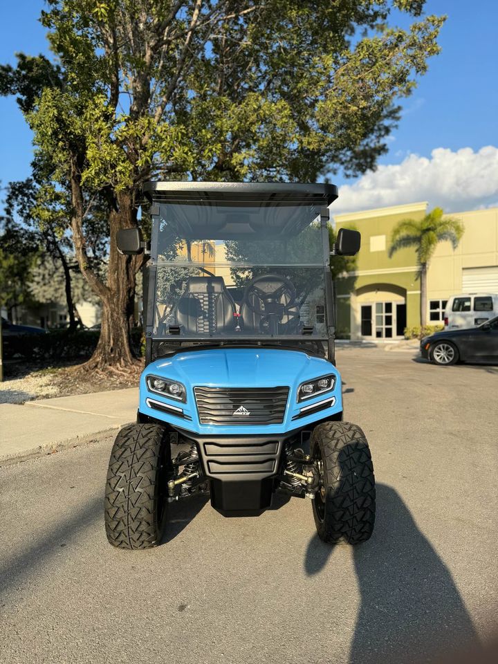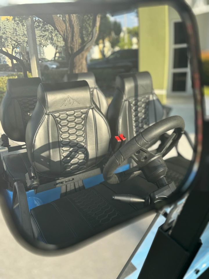 Brand new 2024 Sierra LSV four passenger forward facing electric golf cart. Seaside blue, jet black seats, machined black triton wheels on AT1 street tires 22”. Four facing forward seating 9″ LCD Display On Board Charger Back Up Camera Rear Seat Kit 4 Wheel Hydraulic Disc Brake 105ah Lithium Life PO4 3″ Speakers Wireless Cell Phone Charger 80″ Top with Roof Handles Seat Belts LED Side Mirrors Turn Signal Kit with High/Low Beams Tinted Fold Down Windshield